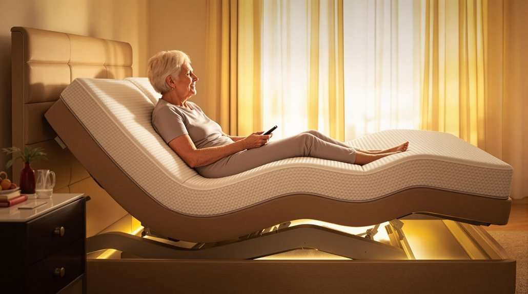 Adjustable beds enhance therapeutic support for elderly individuals through precision biomechanical positioning and advanced safety features. Quality models incorporate programmable memory positions, height adjustability (12-24 inches), and weight capacities ranging from 650-850 pounds. Essential features include under-bed illumination, non-slip mattress supports, and remote-controlled functionality for enhanced mobility. Top-rated options like the Nectar Premier and Tempur-Pedic Ergo Power Base deliver superior lumbar support and massage capabilities. Clinical studies indicate 85-90% of users report improved sleep quality, while 62% experience reduced joint pain. Understanding the full spectrum of features guarantees ideal selection for individual therapeutic needs.