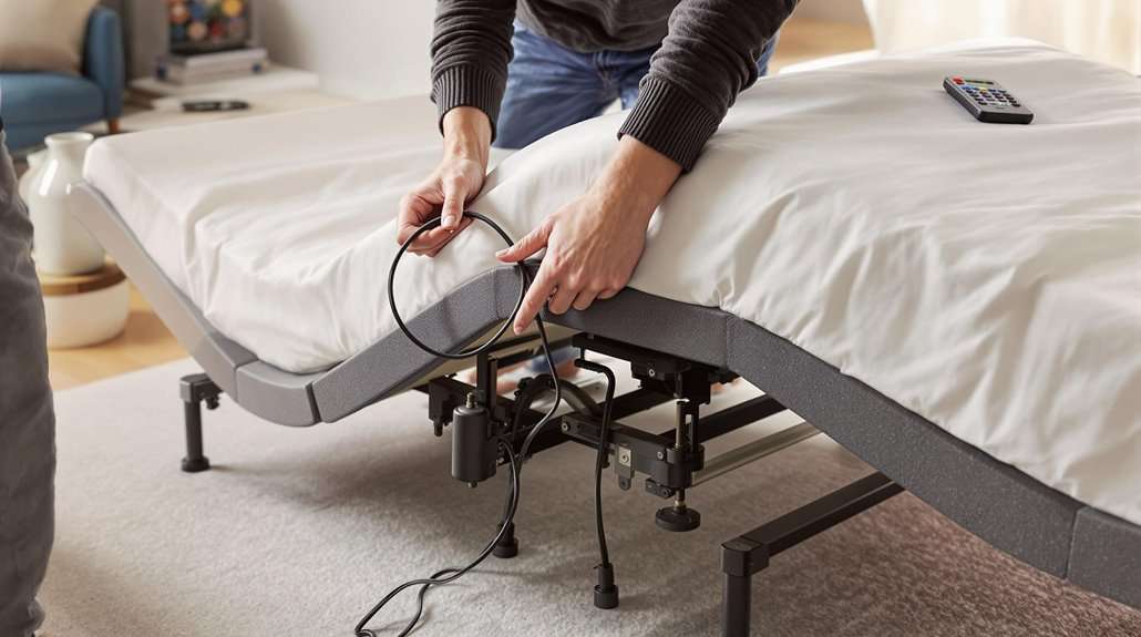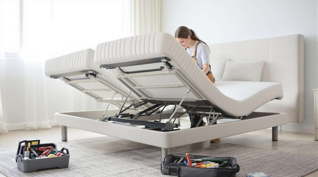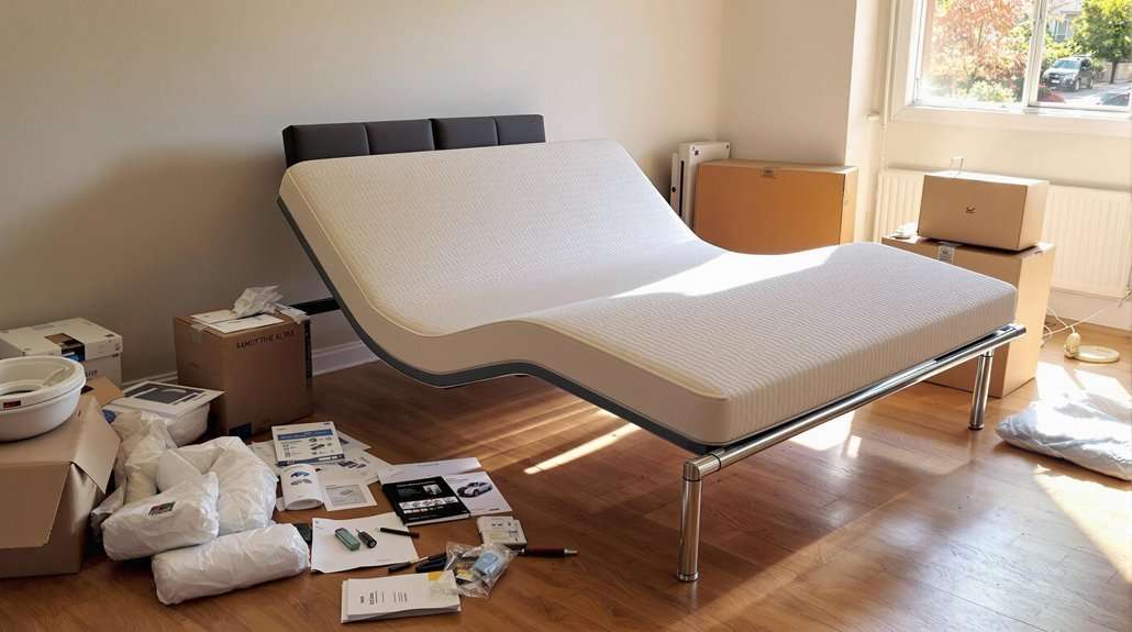 The installation of an adjustable bed at home involves systematic steps that guarantee proper setup and functionality. Unpacking and preparation lay the groundwork for the assembly process, while putting together the bed frame forms the structural foundation. Power and remote setup facilitate operational control, and syncing split bases is important for dual configurations. A final assembly check ensures all components are correctly aligned and functional. Adherence to safety guidelines and troubleshooting techniques is vital for best performance and longevity of the bed system.