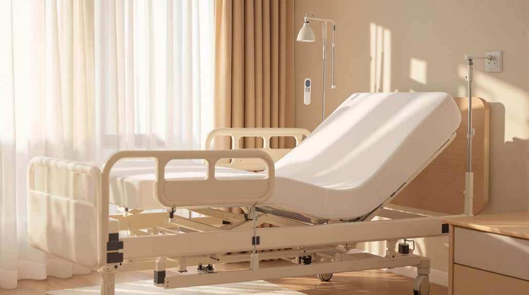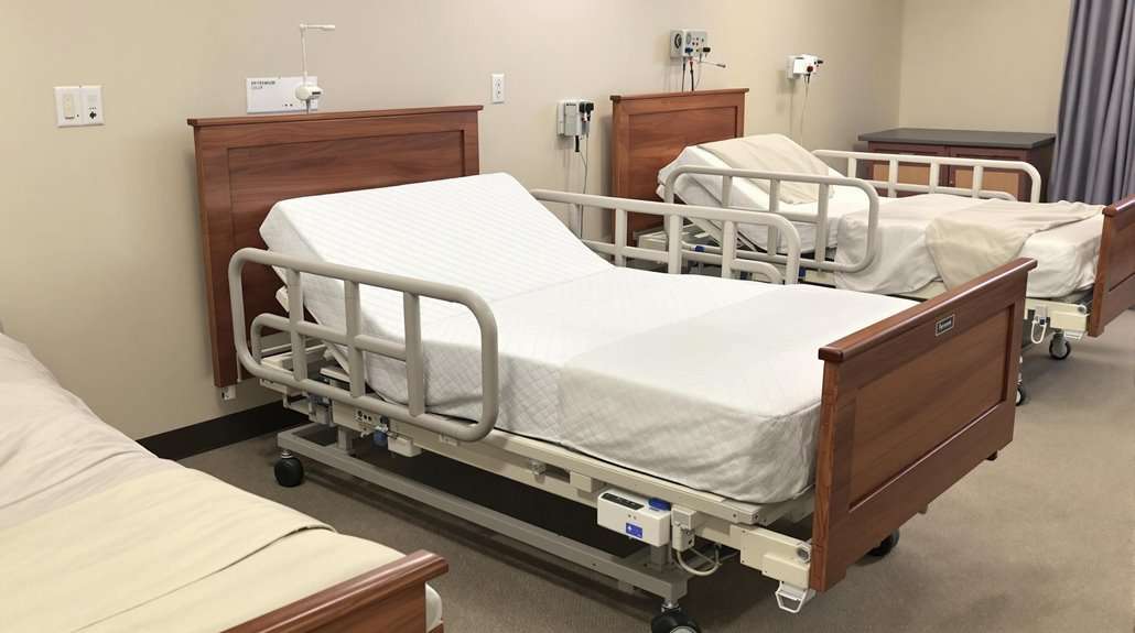 These therapeutic settings are enhanced through supportive devices like pillows and wedges, which help maintain proper body alignment and prevent pressure injuries. Regular repositioning every 2-4 hours is essential for preventing complications, particularly in long-term care settings. The bed’s ability to achieve various positions helps caregivers implement effective positioning techniques while minimizing physical strain. This versatility in positioning options guarantees that elderly residents receive appropriate support for their specific medical conditions while maintaining comfort throughout their care.