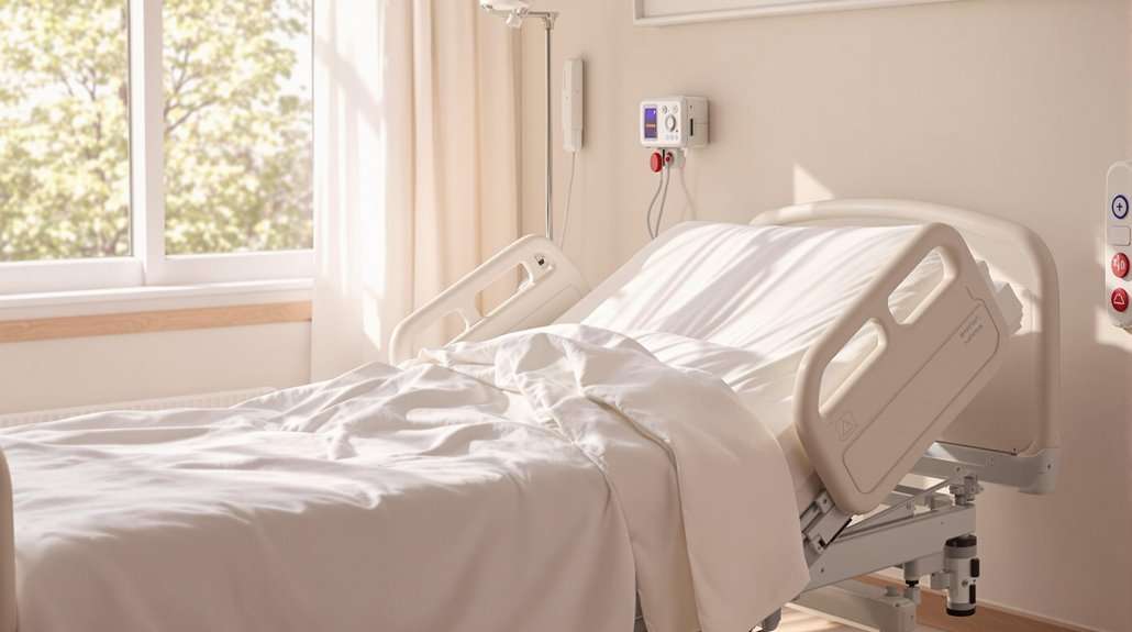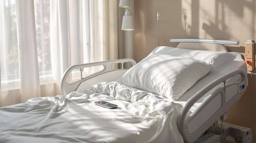 Integrating advanced emergency alert features into specialized beds greatly improves safety protocols for elderly individuals. Alert system integration encompasses various technologies, including bed sensor pads, wireless monitors, and customizable alert mechanisms that detect potential fall risks. These systems provide early warnings to caregivers, enabling swift intervention before accidents occur. Modern bed alarms offer ranges up to 400 feet, ensuring reliable coverage throughout care facilities. The systems feature adjustable sensitivity settings to accommodate different patient needs and minimize false alarms.